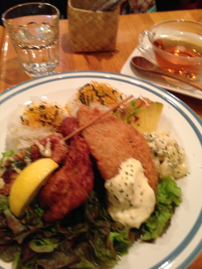 こちらはスパムの串かつ、モチコチキン、マヒマヒのフライが盛り付けられたミックスフライプレート。