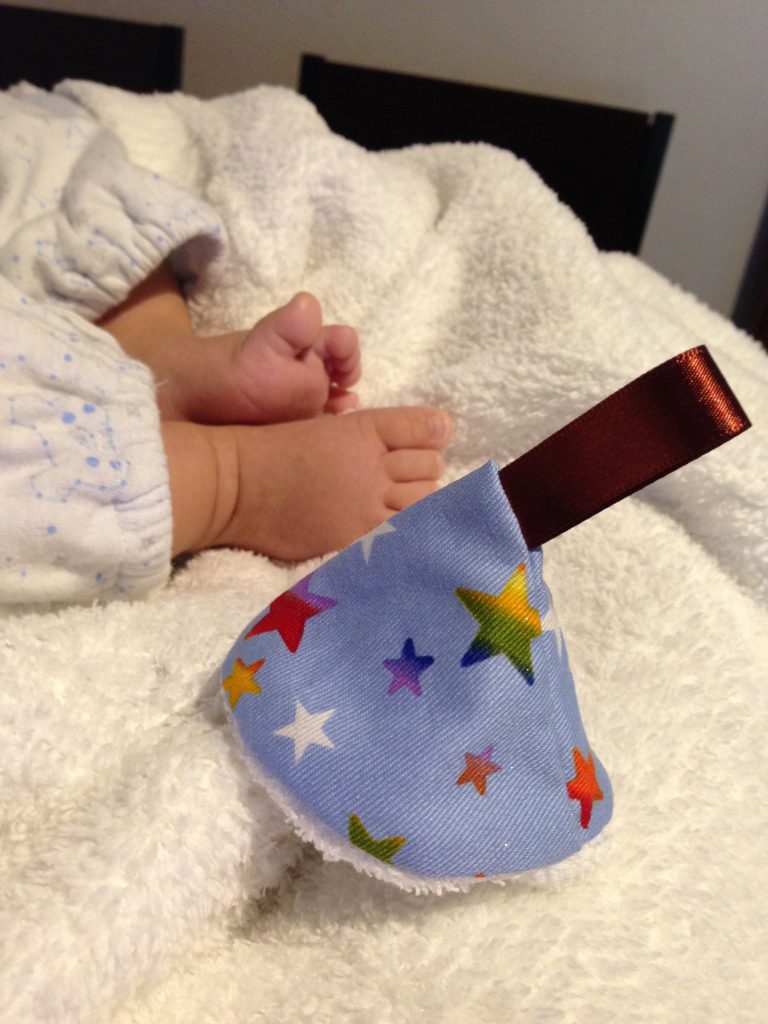 持ちやすくなり、洗って干すときに洗濯ばさみでつまめるようにとタグもつけました。笑