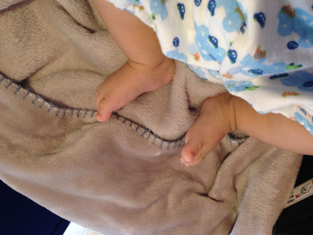 寒くないようにかけたブランケットをキックしながら下げます。