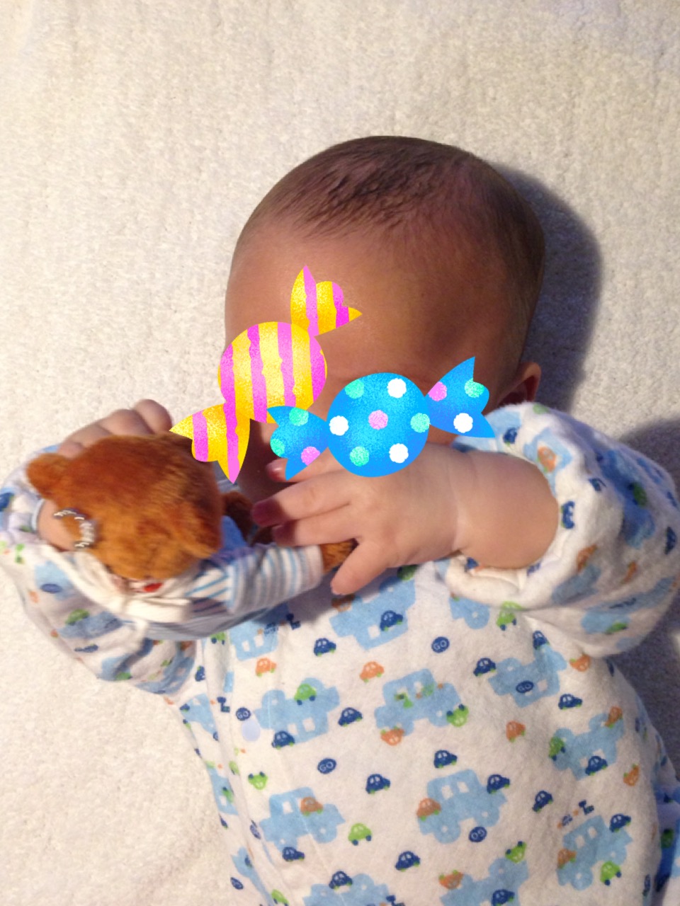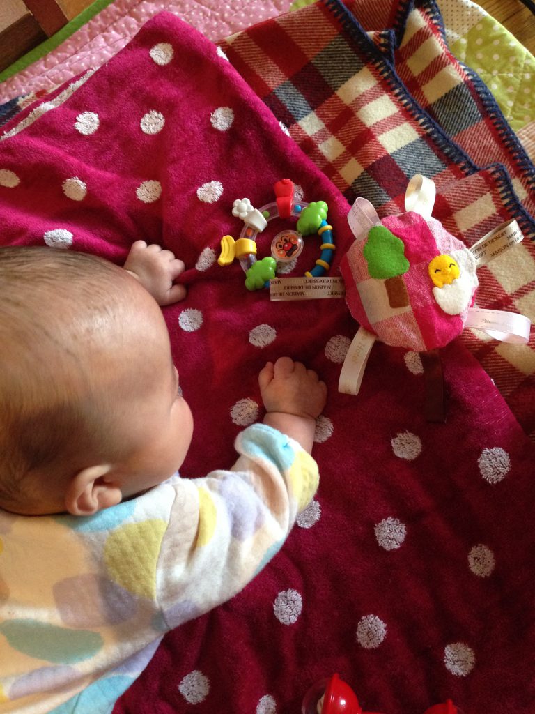 最近は目の前におもちゃを出すと手を伸ばして掴み、遊ぶ(しゃぶる)ようになりました。