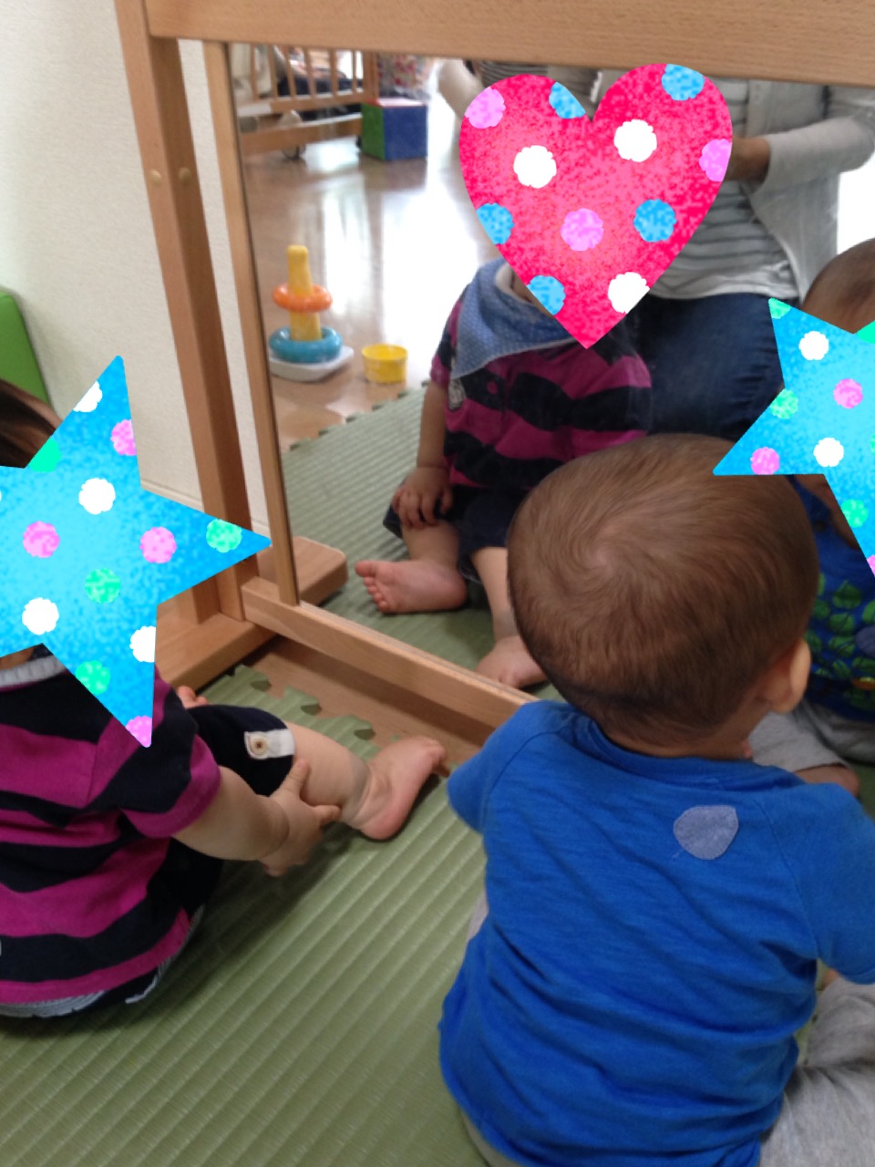 この日は絵本を読み、大きなブロックを触ってみたり、中でも鏡で大興奮していました。