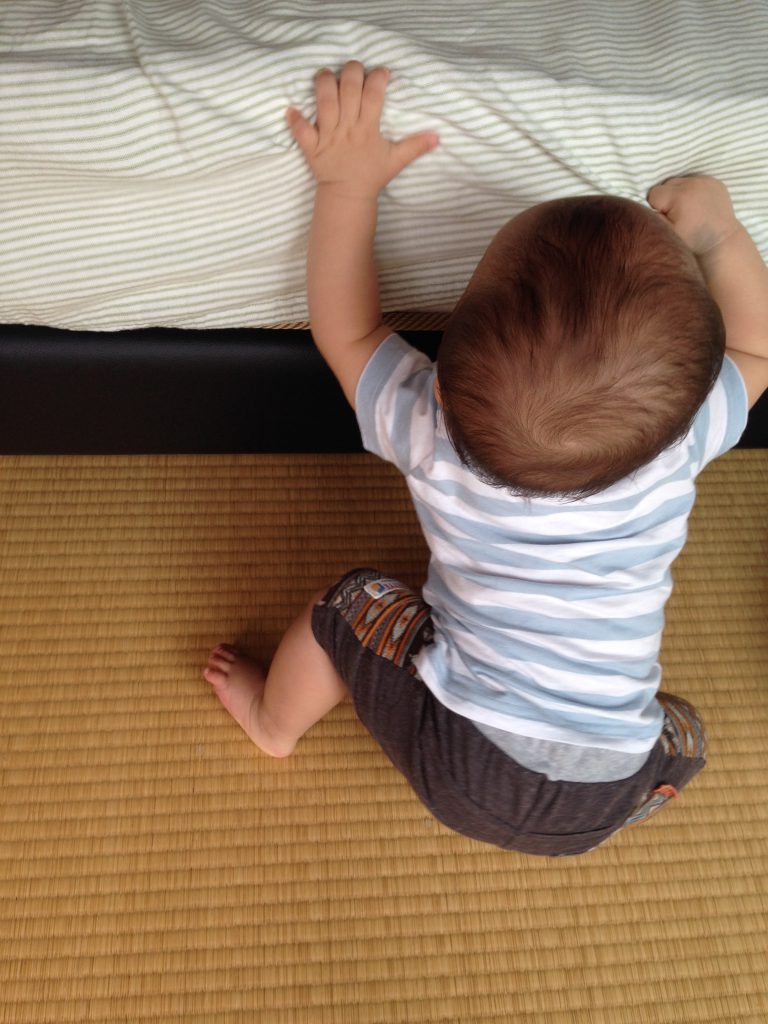 つかまり立ちはもう慣れっこ。