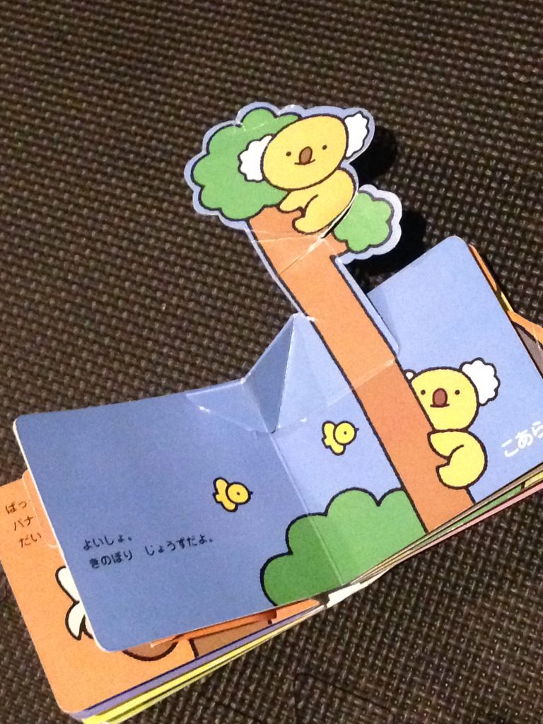 ニョキッと木に登ったコアラさんが現れると顔を上げ、本を両手で高く持ち上げ、「見てー!!」と言いたげな表情でこちらを見ます。